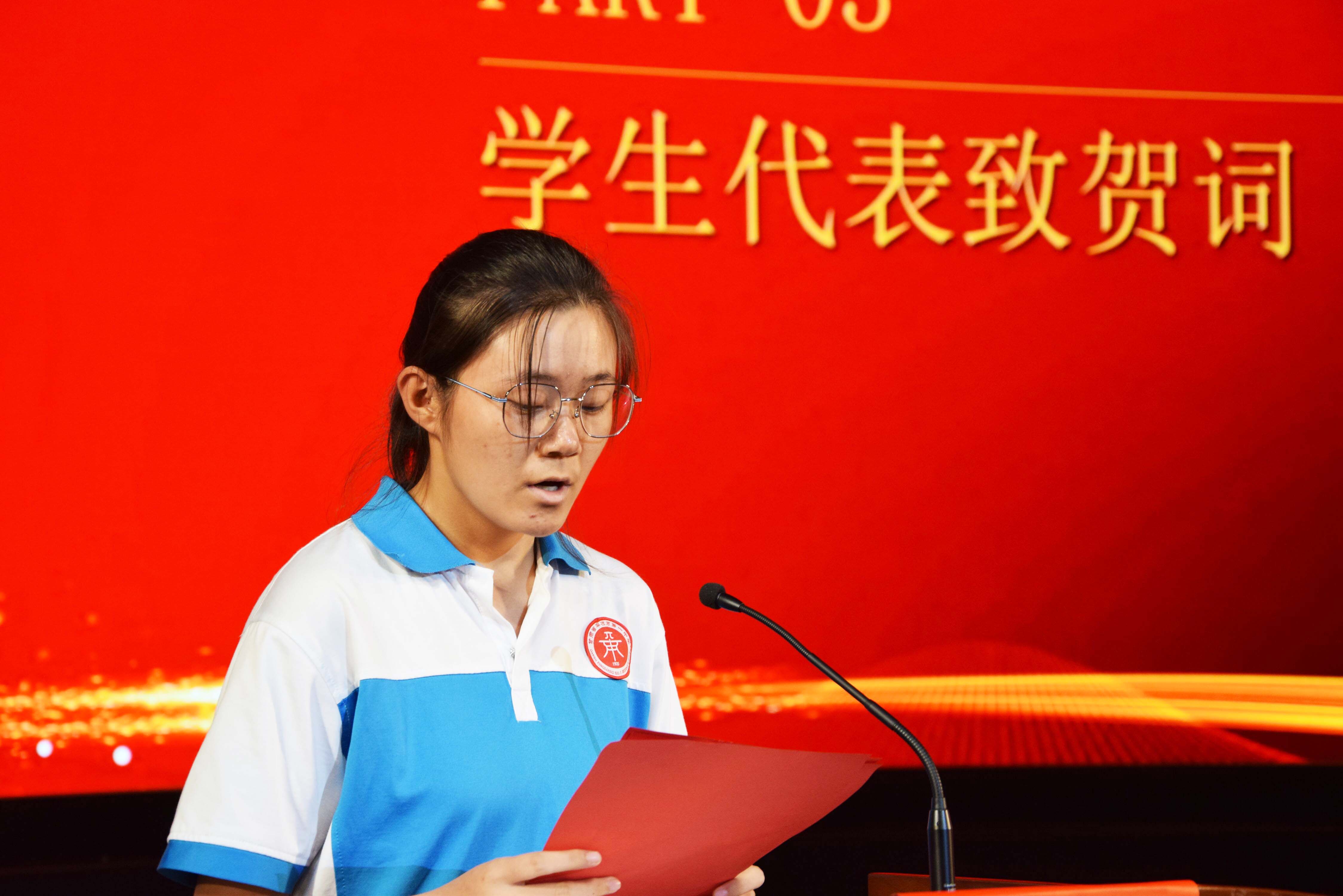 学生代表高一三班白翰玥同学发言,“作为新时代中国青年,我们正处于以中国式现代化全面推进中华民族伟大复兴的关键时期,我们将铭记老师们的教诲,传承老师们的精神,树立远大理想,坚定崇高信念”, 诉说着新时代中国青年的担当,表达着对老师的诚挚感谢!