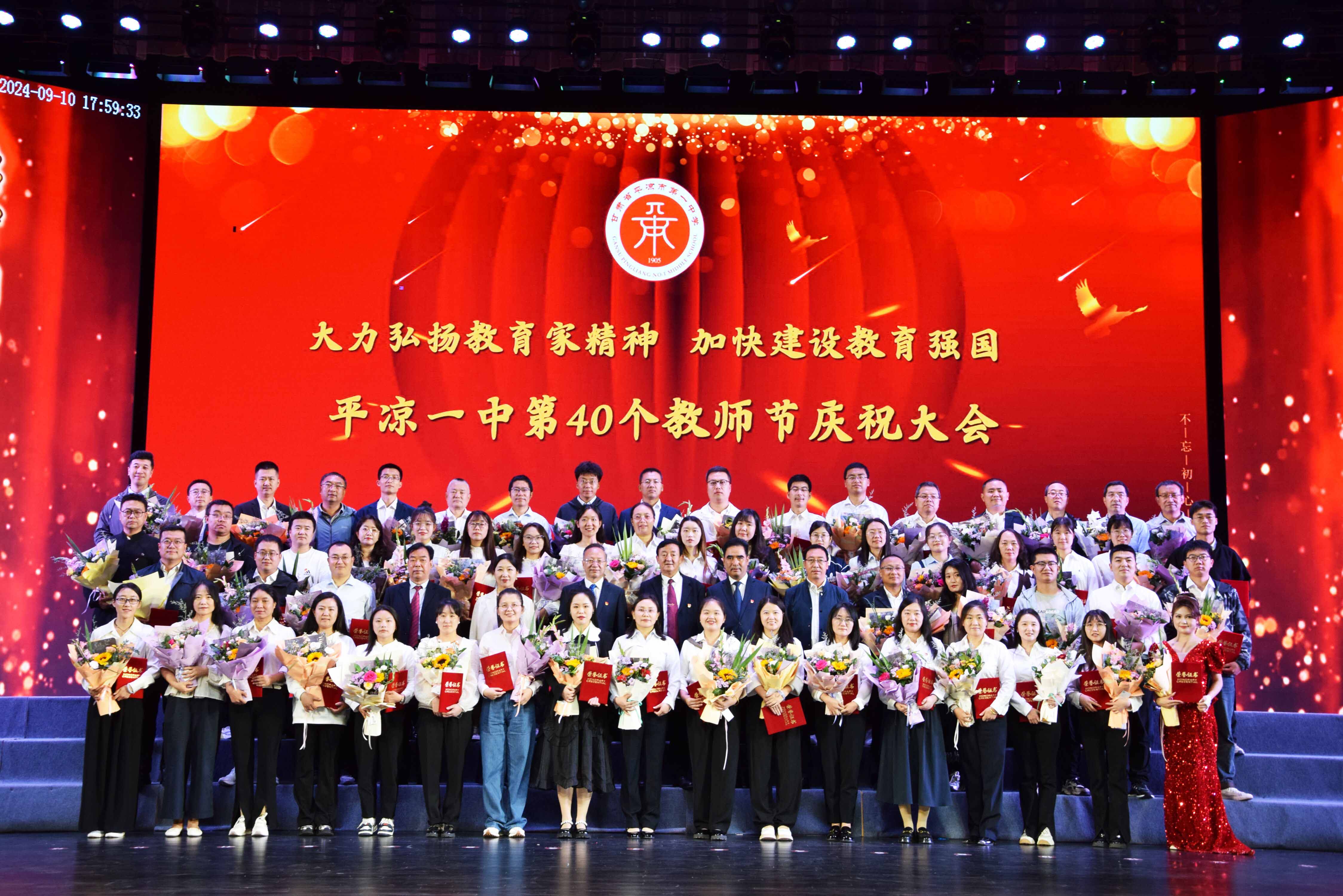 9月10日下午,平凉一中在礼堂召开了第40个教师节庆祝大会,党委书记朱步渊出席大会并讲话,党委副书记、校长李生强主持大会,在家校级领导、全体教职员工、家长和全体学生共4000多人参加大会。